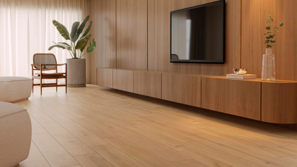 Revestimentos com aparência de pedra natural, como Aledo, ou com leitura amadeirada, como Savona, exemplificam bem essa transição. A madeira, aliás, ocupa um papel central nessa estética: clara, suave, com veios aparentes e tonalidades acolhedoras, ela equilibra o rigor do minimalismo com sensações de conforto e bem-estar.