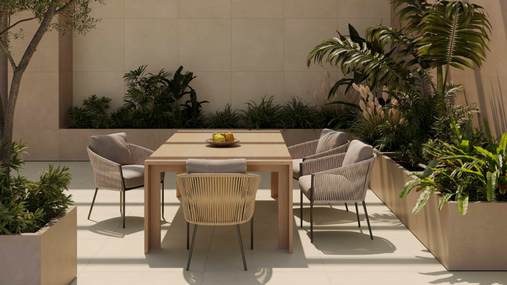 Nos revestimentos, essa mudança é clara. Superfícies cimentícias deixam de ser absolutamente neutras e passam a incorporar grãos, relevos sutis e variações cromáticas que quebram a rigidez visual. É o caso de estéticas inspiradas nos antigos pátios italianos, como o Granulato, onde partículas desenham uma superfície viva, equilibrando rusticidade e atemporalidade. Ou ainda propostas mais puras, como Sólido, que mantém a linguagem urbana, mas com uma leitura mais silenciosa e sofisticada.