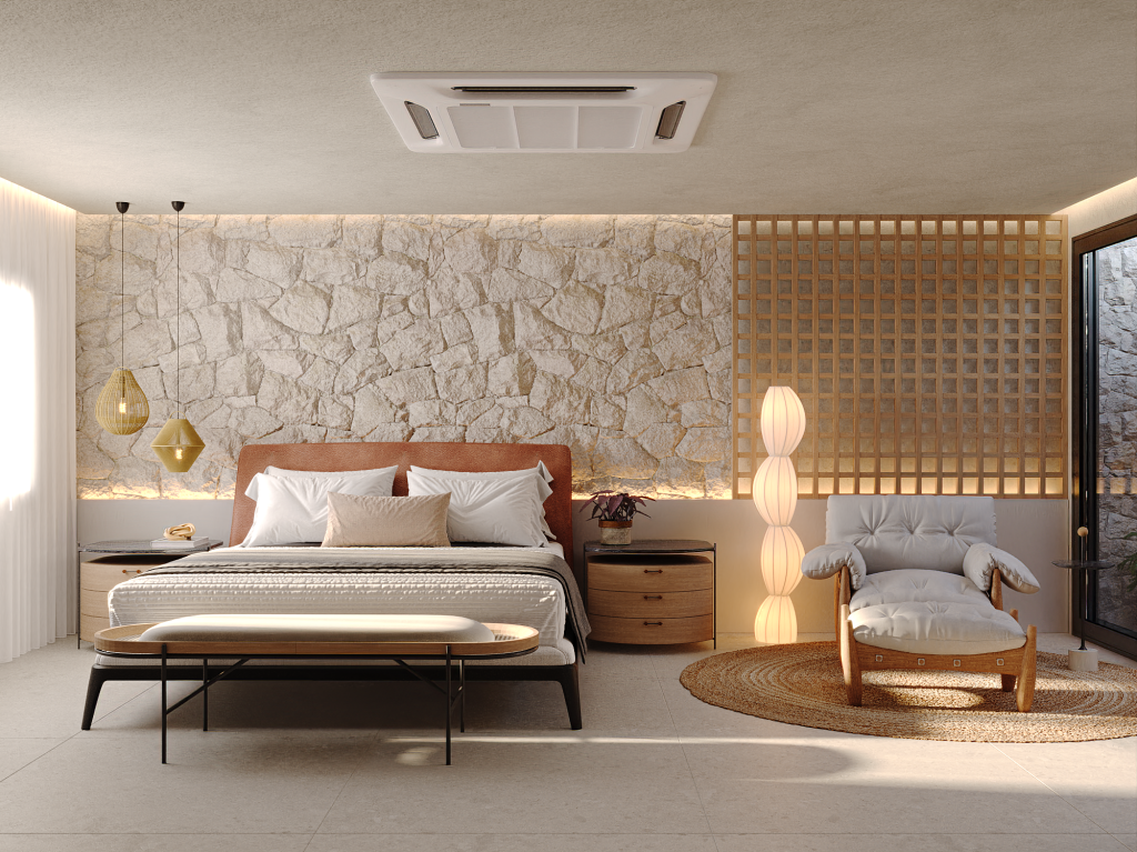 Suíte master com uso do piso Bergamo Off White 1.20x1.20
