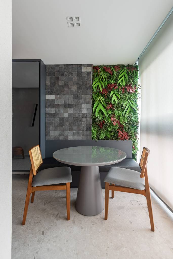 Varanda com uso do Bergamo 1.20x1.20 no piso e Marmo Gris 80x1.60 na bancada