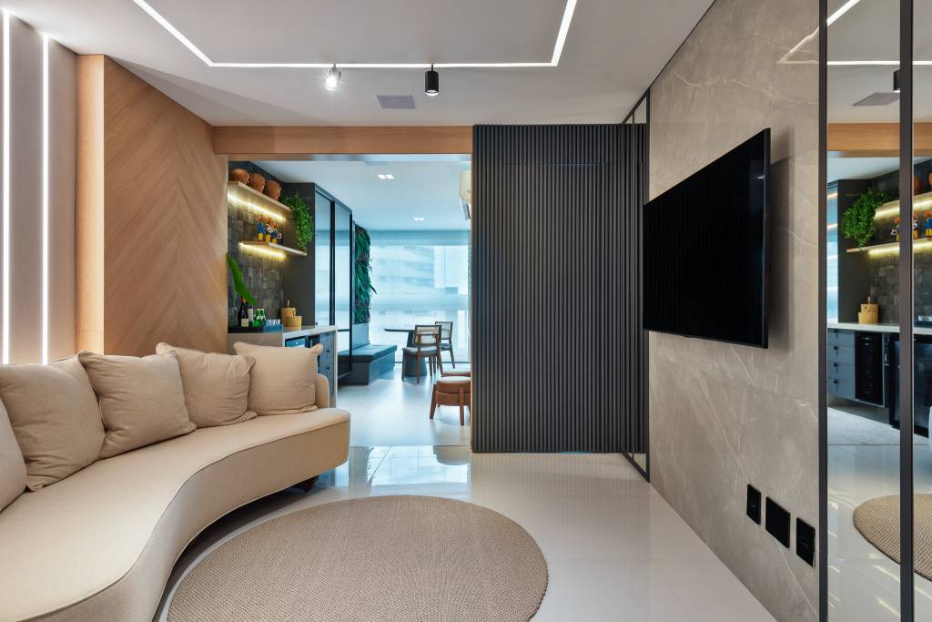 Sala de estar com painel de tv em porcelanato Marmo Gris 1.20x2.40 PO